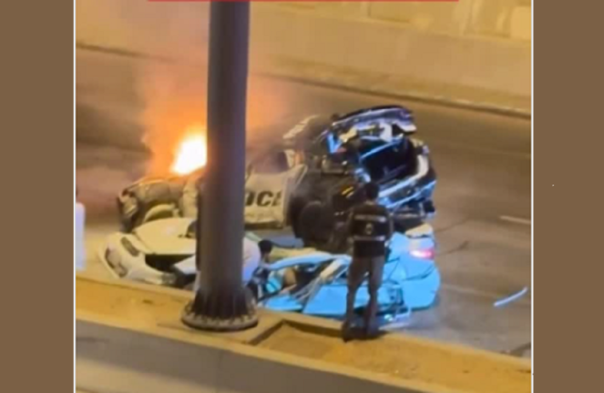 وتداولت حسابات بمواقع التواصل الاجتماعي، صورا من الحادث المأساوي، وتظهر فيه سيارة مهشمة إلى جانب سيارة الشرطة تشتعل فيها النيران.