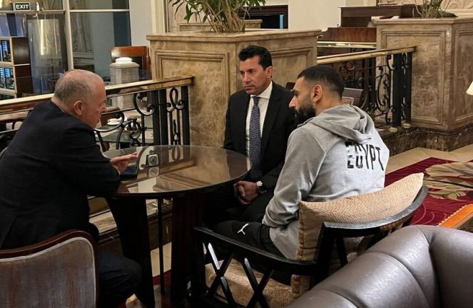 وتوثق لقطات مصافحة وحديث محمد صلاح مع وزير الشباب والرياضة، أشرف صبحي، ورئيس الاتحاد المصري لكرة القدم، هاني أبو ريدة.