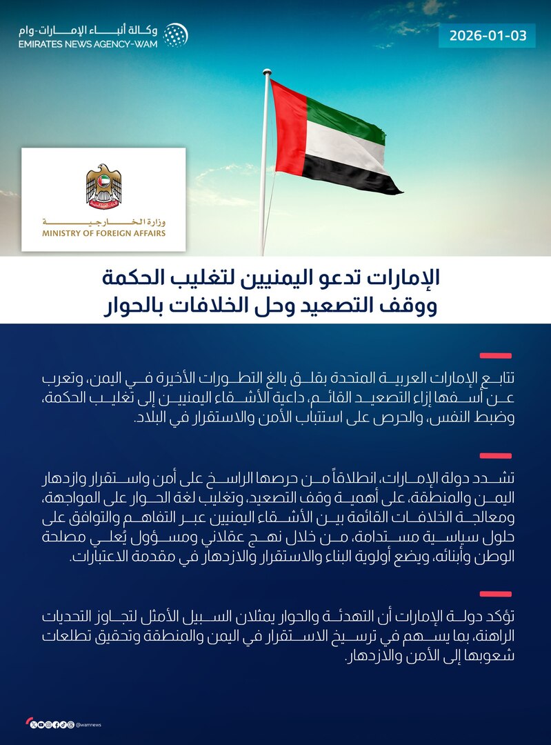 أعلنت الإمارات العربية المتحدة أنها تتابع بقلق بالغ التطورات الأخيرة في اليمن، معربة عن أسفها إزاء التصعيد القائم، داعية اليمنيين إلى تغليب الحكمة، وضبط النفس، والحرص على استتباب الأمن والاستقرار في البلاد.