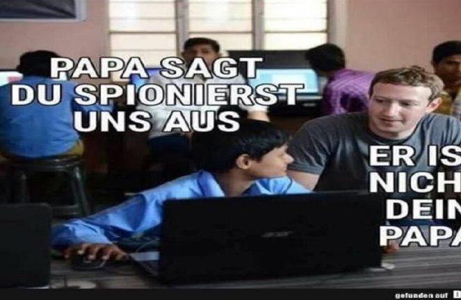 ويظهر في مقدمة الصورة صبي جالسا أمام جهاز الكمبيوتر ملتفت إلى زوكربيرج الواقف على يمينه. فقال صبي لزوكربيرغ: “قال أبي إنك تراقبنا”، فقال رئيس شركة “ميتا ” ردا على ذلك: “هو ليس أباك”.