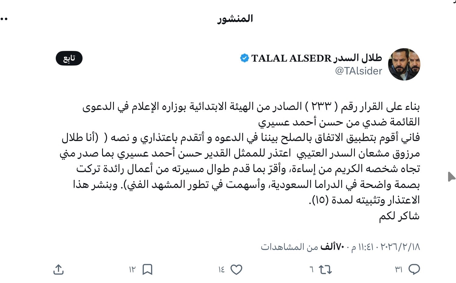 وفي وقت سابق، نشر الفنان السعودي طلال السدر اعتذارا رسميا عبر حسابه على منصة “إكس” للمنتج والفنان حسن عسيري، وذلك تنفيذا لحكم قضائي صدر بحقه إثر إساءات وتغريدات سابقة طالت سمعة ومكانة عسيري.