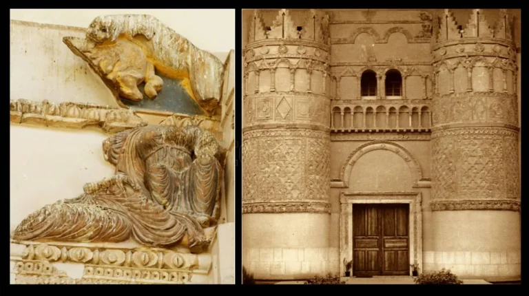 تُزيّن مدخل متحف دمشق الدولي منذ منتصف خمسينات القرن الماضي واجهة معمارية ضخمة يحدّها برجان، وتكسوها شبكات من النقوش الزخرفية المتقنة، تتوزّع على مساحات سطحها، وتبلغ قمّة برجيها. يبلغ طول هذه الواجهة نحو 15 متراً، وتعود إلى الحقبة الأموية، ومصدرها قصر يُعرف باسم قصر الحير الغربي، كشفت عنه بعثة فرنسية قادها عالم الآثار دانيال شلومبرجير بين عام 1936 وعام 1938.