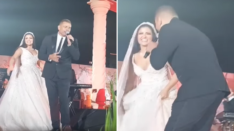 ونشر الإعلامي المصري هاني عزب الفيديو عبر صفحته الرسمية على “فيسبوك”، وظهر فيه عمرو دياب وهو مندمج بالغناء ولم ينتبه أنه داس على الفستان، لكن العروس طلبت منه بلطف أن يبتعد لأنها لم تستطع الرقص.