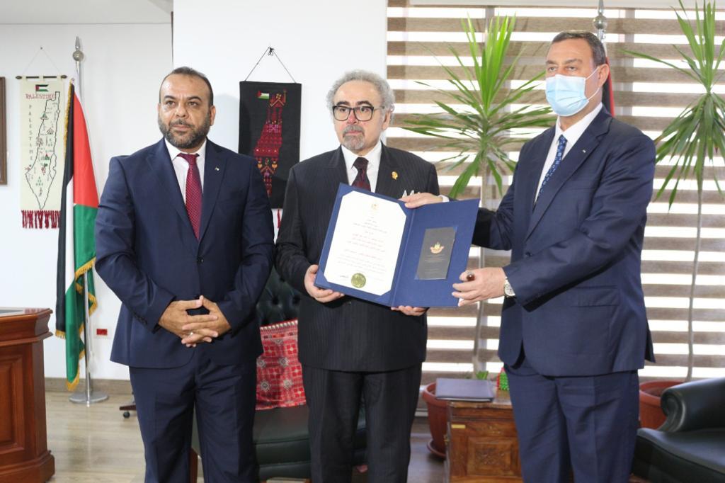 جاء ذلك تقديرًا لجهوده في دعم القضية الفلسطينية وثقافتها وتثبيتا لحضورها في المشهد الثقافي العربي والدولي ومساهماته الأكاديمية والفكرية بالقضايا العربية العادلة، وفي مقدمتها فلسطين، وذلك في مقر سفارة فلسطين بالقاهرة وذلك بحضور عدد من الكتاب ومستشاري السفارة.
