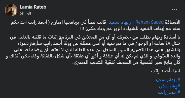 وطالبت ابنة أحمد راتب الإعلامية ريهام سعيد بالتواصل معها خلال 48 ساعة وإلا سوف تقاضيها بتهمة التشهير، مشيرة إلى أن ما حدث رمي اتهامات لشخص متوفى لم يبق له إلا عمله الصالح ولا نريد زج اسم والدي في أي أزمة، مشيرة إلى أن ريهام سعيد تحب افتعال التريند، ولذلك أعادت قضية وفاء مكي للساحة من جديد بعد أكثر من 22 عاما.