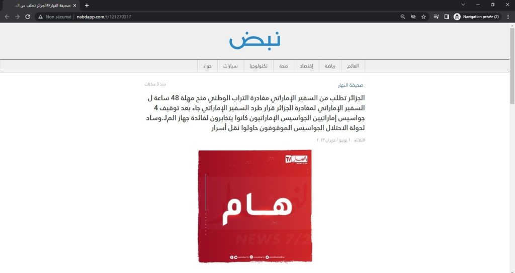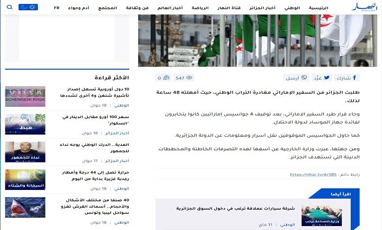السلطات الجزائرية المختصة تستدعي مسؤولي قناة “النهار” بسبب نشر معلومات كاذبة حول سفير الإمارات