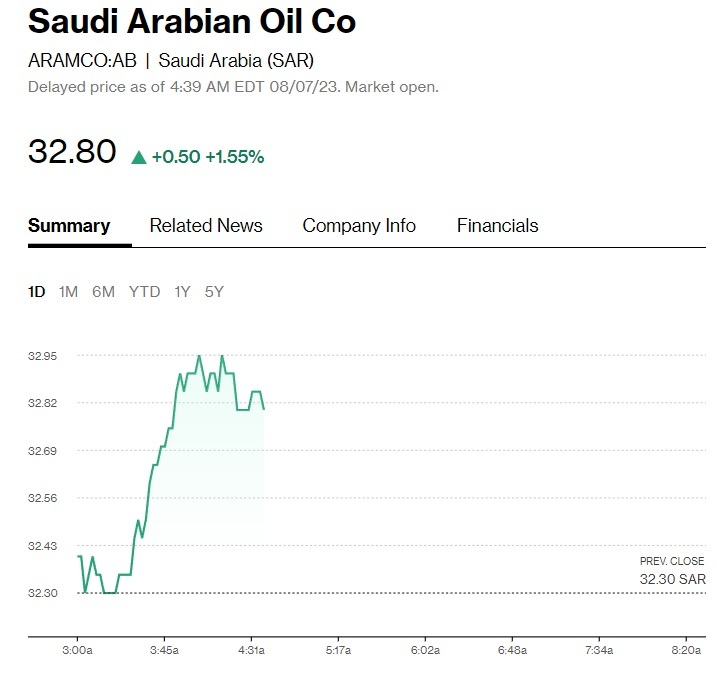 وبحلول الساعة 11:30 بتوقيت موسكو، ارتفع سهم “أرامكو” بنسبة 1.55% إلى 32.80 ريال سعودي، وفقا لبيانات وكالة “بلومبرغ”.