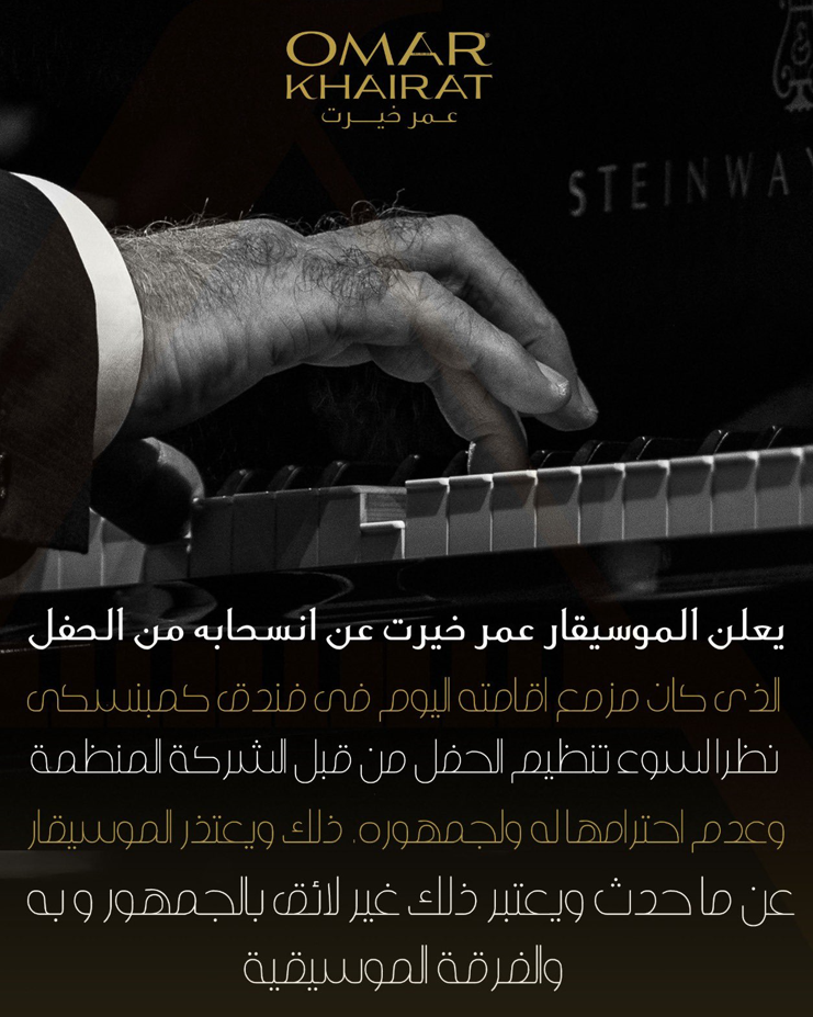 وعلى حسابه في منصة “إكس”، كتب عمر خيرت: “يعلن الموسيقار عمر خيرت عن انسحابه من الحفل الذى كان مزمعا إقامته اليوم في فندق كمبنسكي نظرا لسوء تنظيم الحفل من قبل الشركة المنظمة وعدم احترامها له ولجمهوره”.