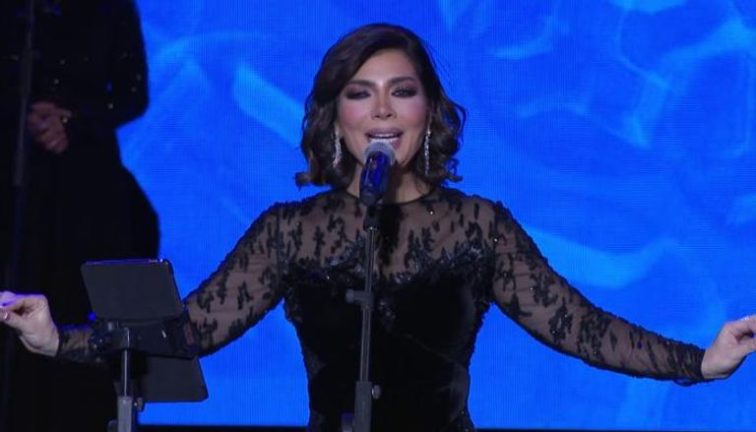 أصالة تألقت في هذا الحفل بإطلالة فلسطينية مميزة، حيث ارتدت عباءة مزينة بألوان علم فلسطين.