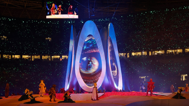 وشهد الحفل عدة عروض غنائية واستعراضية، وكانت فلسطين حاضرة في حفل الافتتاح عبر أغنية “لأجلك يا مدينة الصلاة أصلي”.