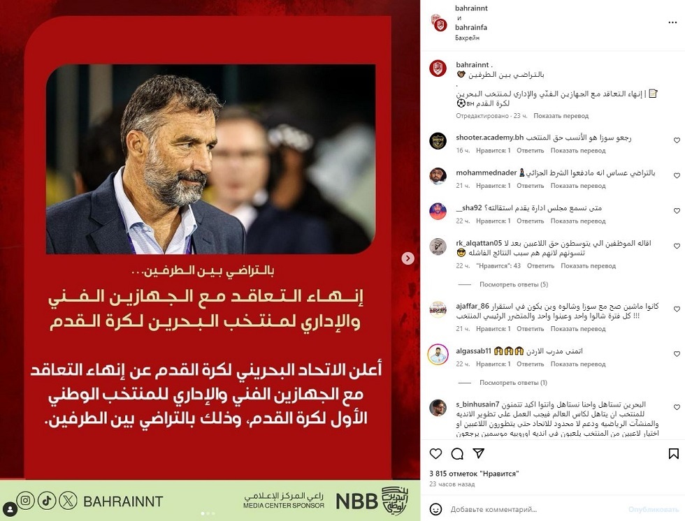 وجاء في بيان الاتحاد البحريني لكرة القدم: “إنهاء التعاقد مع الجهازين الفني والإداري للمنتخب الوطني الأول لكرة القدم، وذلك بالتراضي بين الطرفين”.