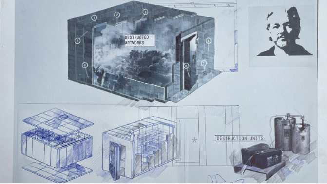 جاء ذلك في حوار لمولودكين مع قناة “سكاي نيوز”، قال فيه الفنان إنه جمع 16 عملا فنيا، تقدر قيمتها مجتمعة بأكثر من 45 مليون دولار، في خزنة تزن 29 طنا تحتوي على مادة “شديدة التآكل”، كما يوجد مضخة هوائية تربط برميلين أحدهما يحتوي على مسحوق حمضي والآخر مزود بمسرع يمكن أن يسبب تفاعلا كيميائيا قويا بما يكفي لتحويل محتويات الخزنة إلى حطام، وفقا لمولودكين.
