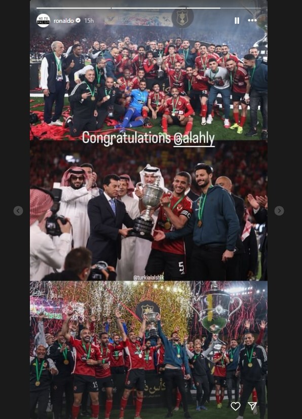 ونشر رونالدو على حسابه في موقع “إنستغرام” صورا من تتويج الأهلي بالكأس، وكتب عليها “تهانينا” وأشار للحساب الرسمي لـ”المارد الأحمر”.
