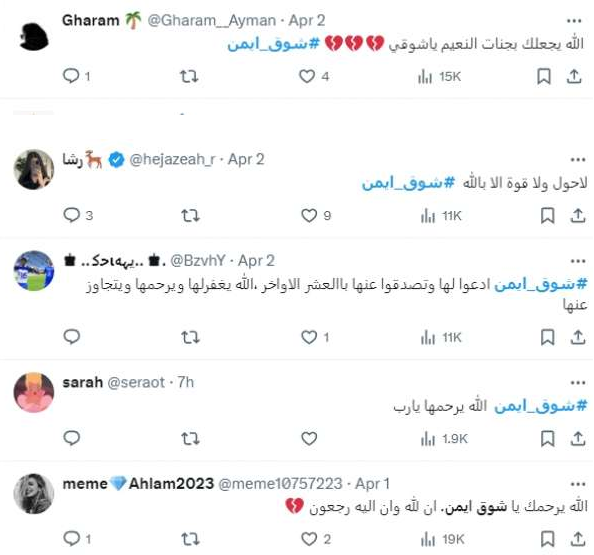 وأعلن الفنان السعودي عيسى ابن صالح، وفاة الفنانة الشابة عبر حسابه في موقع “X” بقوله: “انتقلت إلى رحمة الله زميلتنا ببرنامج “سعودي آيدول” شوق أيمن، الله يرحمها ويغفر لها يارب، أصابنا الذهول بهذا الخبر المفجع، نسأل الله أن يتقبلها في الجنان، لم نعهد منها إلا كل خير، دعواتكم لها”.