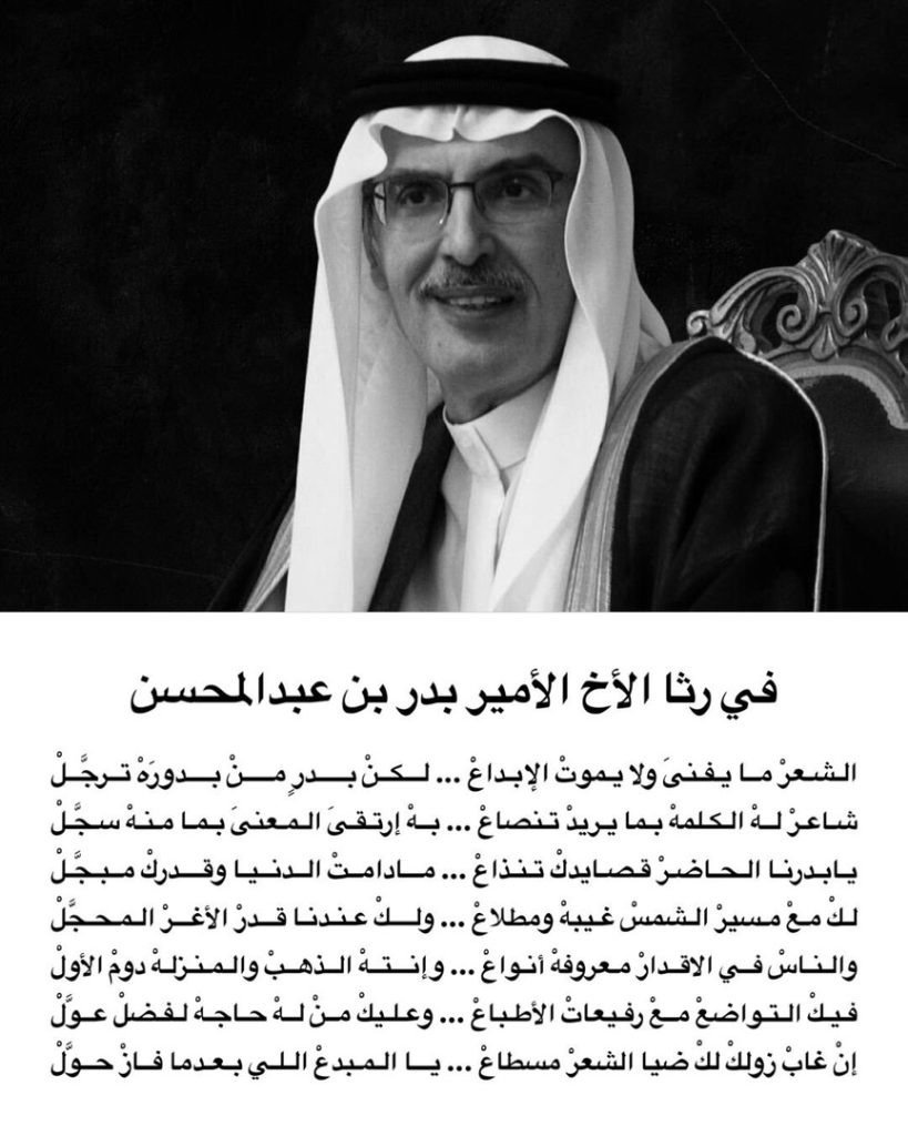 وجاءت قصيدة بن راشد، وهو نائب رئيس الإمارات ورئيس مجلس الوزراء، تحت عنوان “في رثاء الأخ الأمير بدر بن عبد المحسن”: