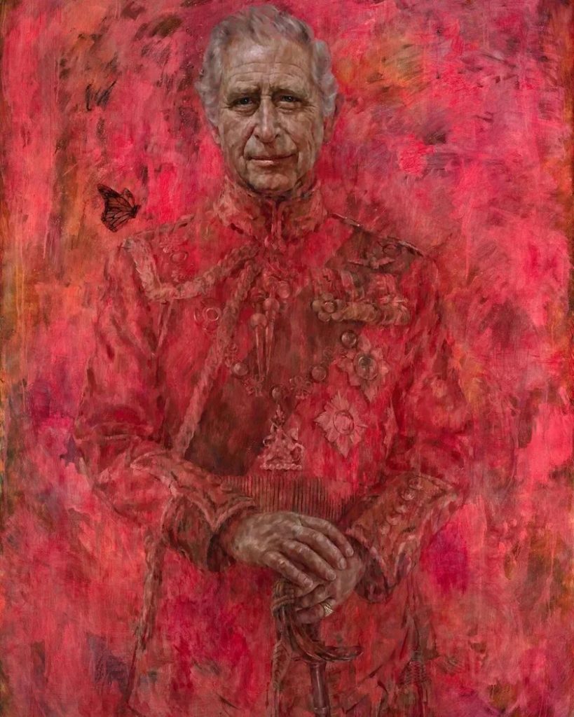 أثار البورتريه الجديد الأحمر اللون للملك البريطاني تشارلز الثالث مناقشات على شبكات التواصل الاجتماعي بسبب رمزيته، وحسبما ذكرت صحيفة “نيويورك تايمز” فإن اللوحة تظهر الملك واقفا بزي الحرس الويلزي، ويداه مستندتان على مقبض سيفه، وعلى وجهه نصف ابتسامة، وفراشة تحوم فوق كتفه الأيمن. والجسم والخلفية في اللوحة بنفس اللون الأحمر الفاقع.